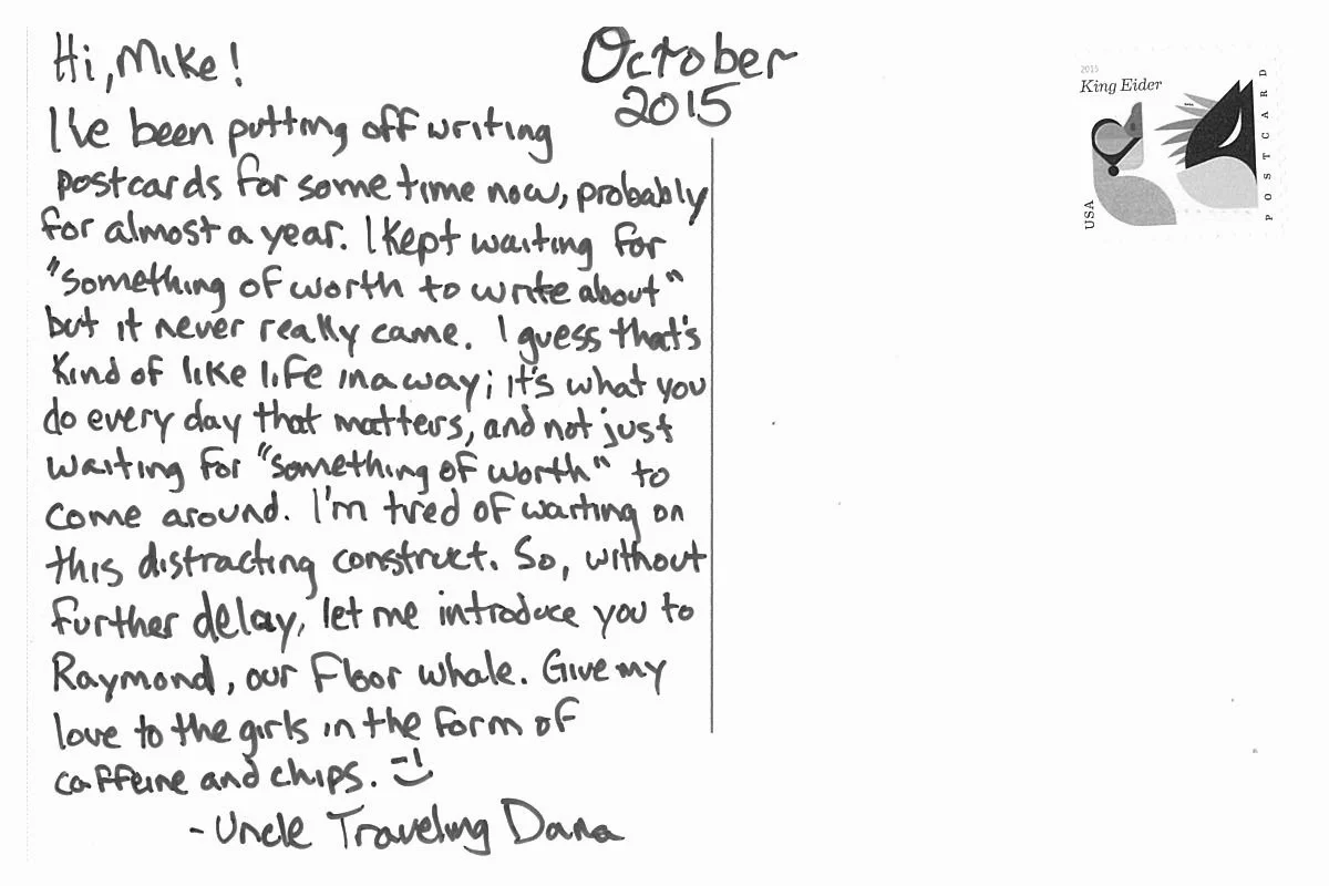 I've been putting off writing postcards for some time now, probably for almost a year. I kept waiting for "something of worth to write about" but it never really came. I guess that's kind of like life in a way; it's what you do everyday that matters, and not just waiting for "something of worth" to come around. I'm tired of waiting on this distracting construct. So, without further delay, let me introduce you to Raymond (affiliate link), our floor whale. Give my love to the girls in the form of caffeine and chips. ;)