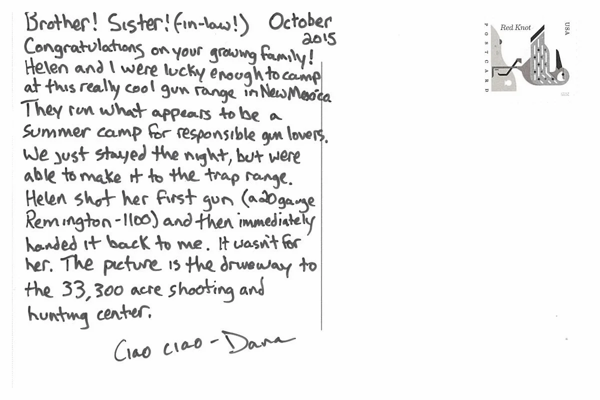 Congratulations on your growing family! Helen and I were lucky enough to camp at this really cool gun range in New Mexico. They run what appears to be a summer camp for responsible gun lovers. We just stayed the night, but were able to make it to the trap range. Helen shot her first gun (a 20 gauge Remington - 1100) and then immediately handed it back to me. It wasn't for her. The picture is the driveway to the 33,300 acre shooting and hunting center.
