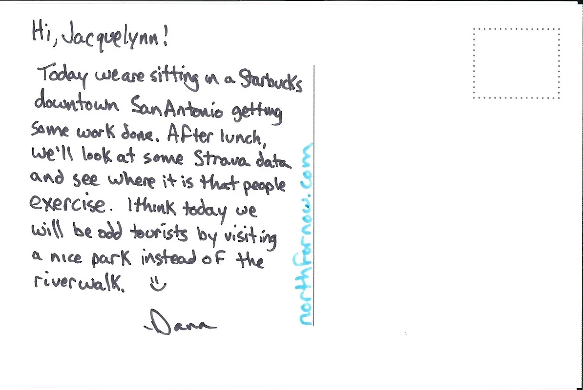 Today we are sitting in a Starbucks downtown San Antonio getting some work done. After lunch, we’ll look at some Strava data and see where it is that people exercise. I think today we will be odd tourists by visiting a nice park instead of the riverwalk. :)
