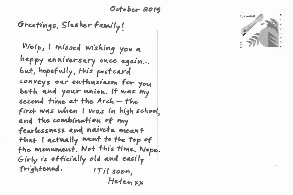 Welp, I missed wishing you a happy anniversary once again...but, hopefully, this postcard conveys our enthusiasm for you both and your union. It was my second time at the Arch - the first was when I was in high school, and the combination of my fearlessness and naivete meant that I actually went to the top of the monument. Not this time. Nope. Girly is officially old and easily frightened.